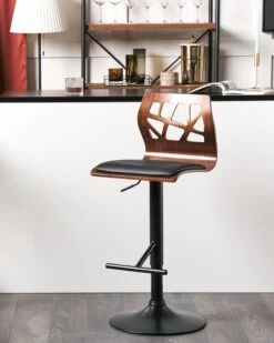 Sgabello Da Bar Ecopelle Nera E Legno Scuro PETERSBURG II